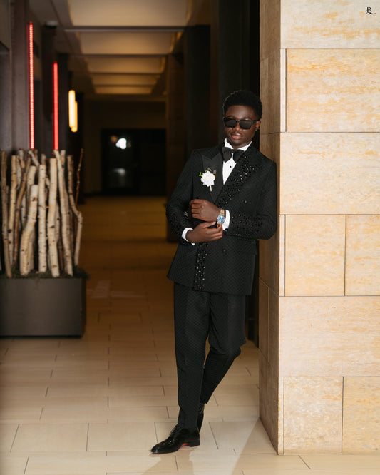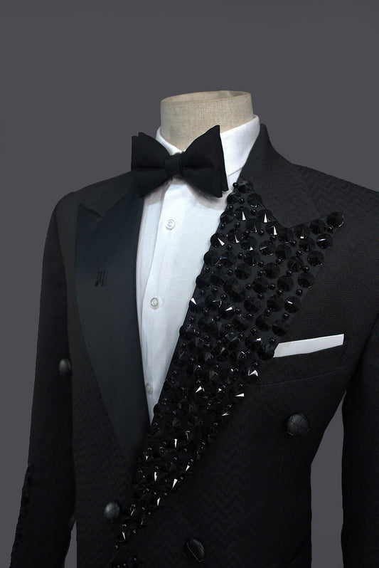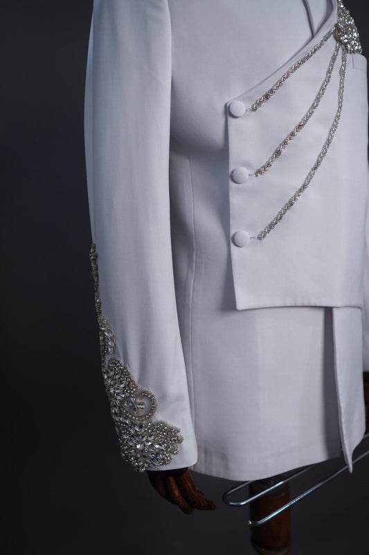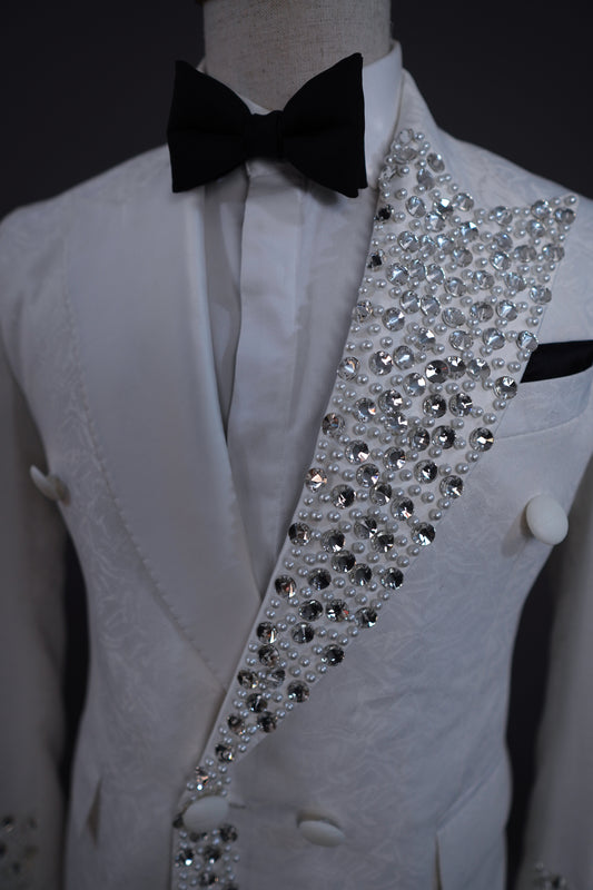 White Jaquard Two Piece tuxedo laced with crystal pearl beads