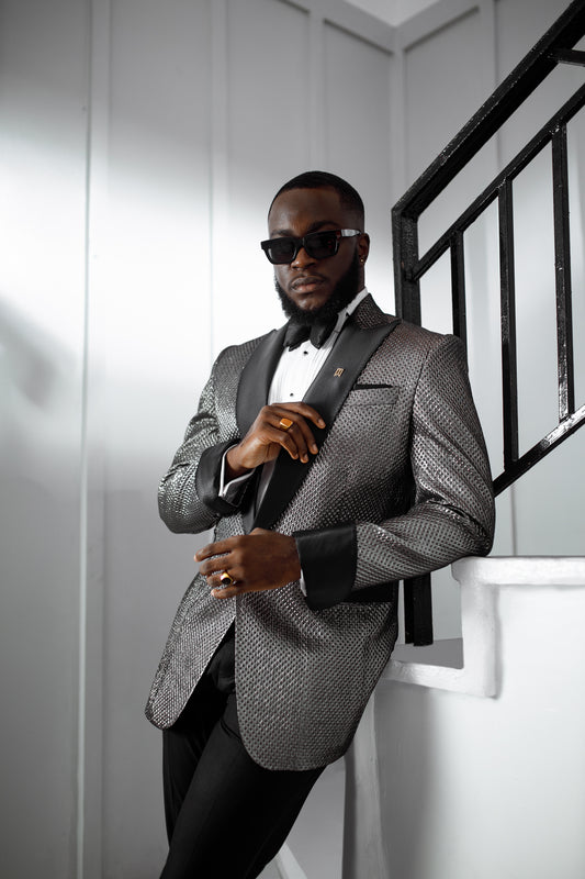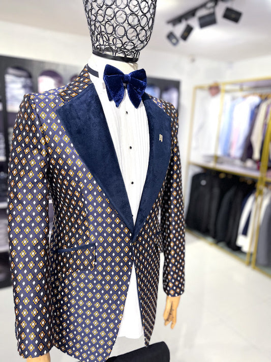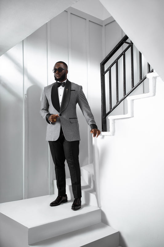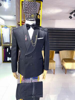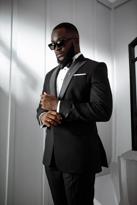 Black tuxedo with velvet lapel and Chinese button with black tuxedo pant