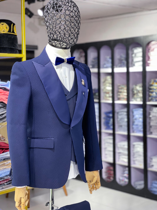 Ivory shawl lapel tuxedo with blue waistcoat and blue tux pants