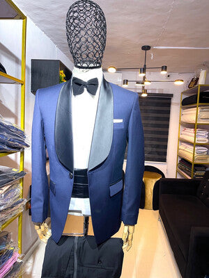 Navy blue Tuxedo (3pc) with black satin cummerbund and black wool tux pants.